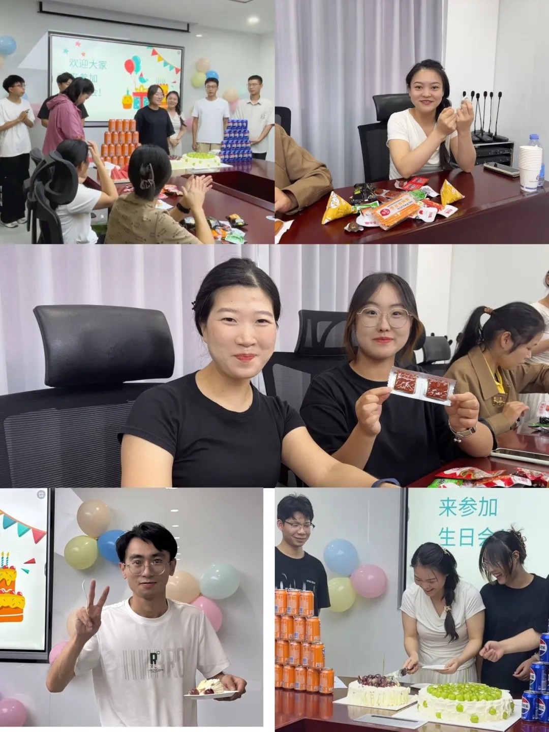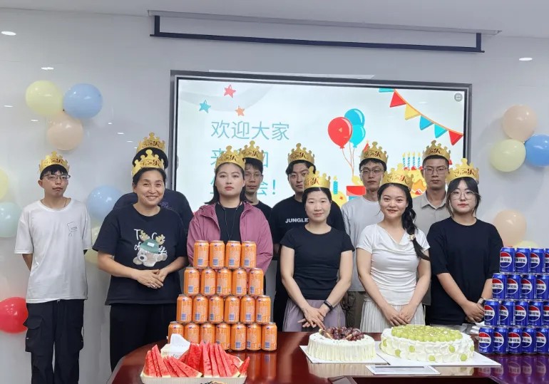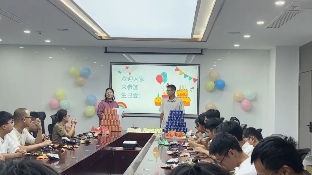 生日会现场早已被精心布置,长桌上摆满了各式美味:清甜多汁的水果拼盘、精致可爱的生日蛋糕、丰富可口的零食饮品……每一份点心都承载着公司对员工们细致入微的关怀。
