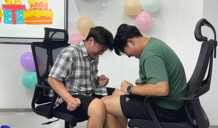 吃饱喝足,怎能不来点刺激的?本次活动特别设置了“力气大赛”游戏环节——经典项目掰手腕和趣味项目“掰大腿”接连上演!